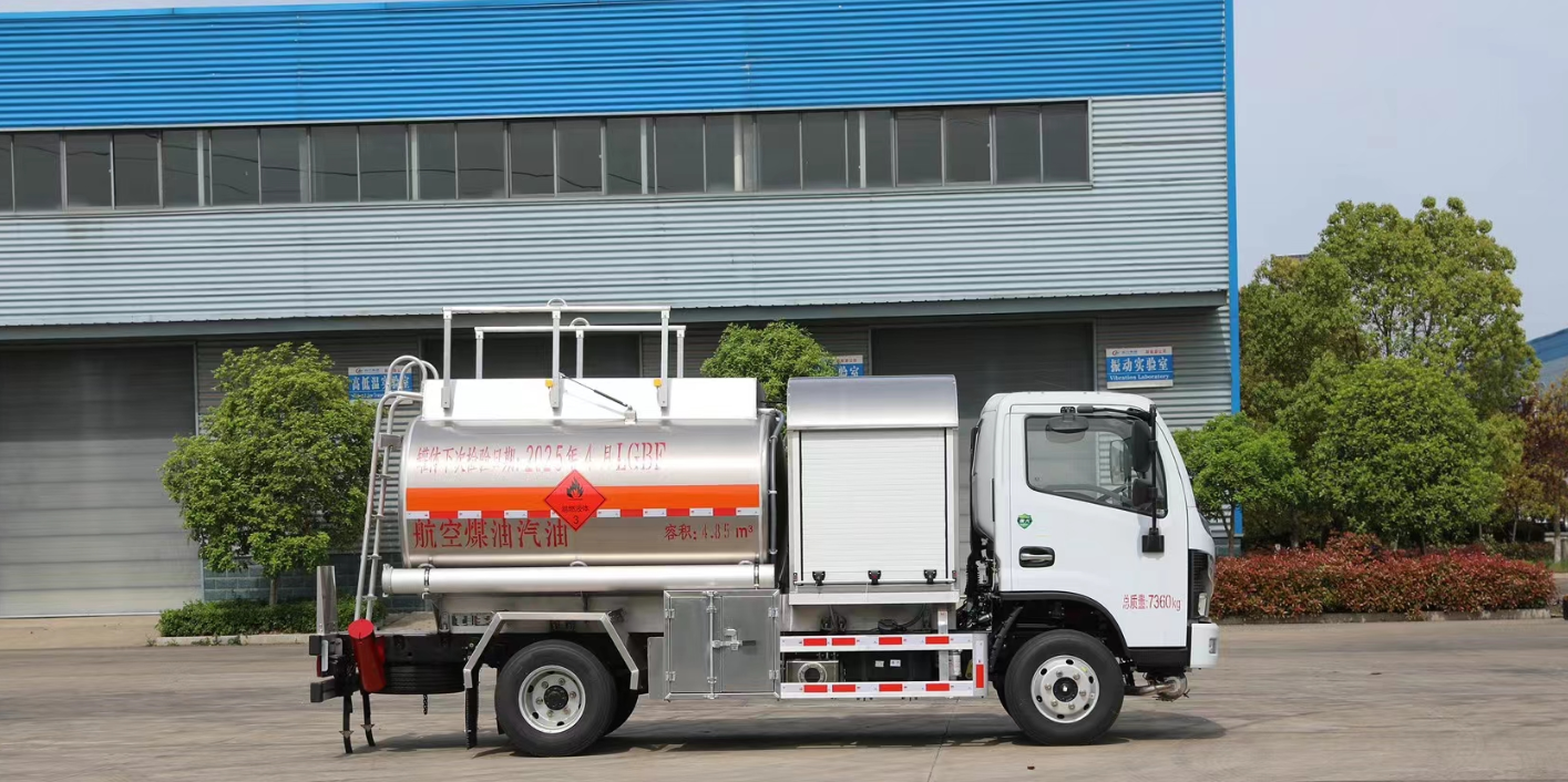| Upper body configuration | The tank is square-round, with a volume of 5 cubic meters, a single compartment, and is made of 5182 aluminum alloy. The cylinder is 5.5mm thick, and the end caps are 5.7mm thick. A single aluminum alloy European standard manhole with a built-in breather valve is located in the center of the tank top. Manual aluminum alloy guardrails are installed on both sides of the tank top, along with a removable aluminum alloy rear ladder. The control cabinet (aluminum alloy) includes an explosion-proof light and an external electrostatic reel. The refueling pump is an aluminum alloy pump (mechanical seal type). The flow meter is a Hefei Jingda Instrument 0.2-level accuracy, 50mm diameter rotary valve flow meter. The filter separator is a 5-core filter (including 2 separators and 3 coalescing filter elements). Gravity refueling is achieved using a 15-meter aviation kerosene-specific hose reel with an aviation kerosene-specific nozzle. The level gauge has a 10-inch aluminum alloy dial. The operation control system is integrated. The unloading box on the left side of the tank is equipped with an oil and gas recovery system. An emergency shut-off valve with a 5 km/h speed limit is installed according to new regulations. A red button for the emergency shut-off valve is installed at the rear of the tank. One standard aluminum alloy toolbox, two oil drain hoses, one 1-inch drain valve at the front end of each aluminum alloy round barrel on both sides of the tank, all boxes are equipped with container lock bars for easy lock matching by users, rubber plugs are installed at the bottom of the outlet box, and plastic fire extinguisher cartridges (8KG) are equipped on both sides of the rear of the tank. | ||